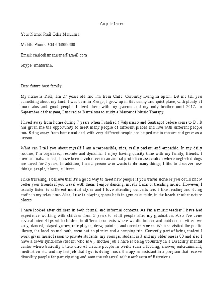 My host family letter. Dear host family My name is Mayara but my friends call me May. Each au pair is personally interviewed evaluated for English level and takes a DISC personality test.